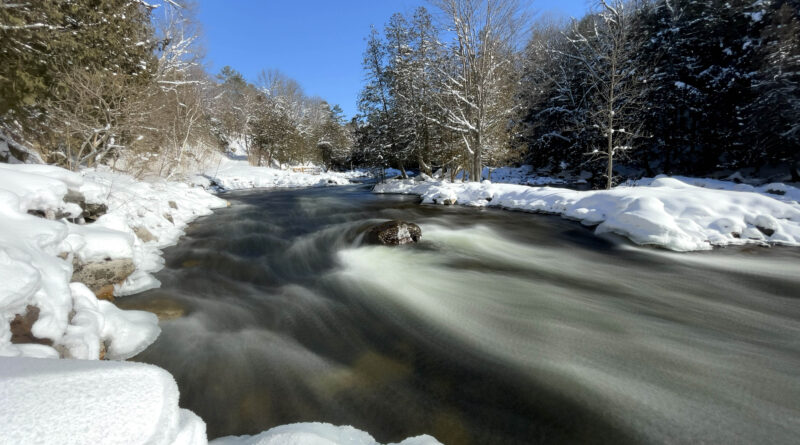 What is striking about snowshoeing at the Minden White Water Preserve (MWWP) is the spectrum of sound you will experience on this two-kilometer loop. From the raging rumble of frothy water cascading over ice-capped rocks to the quiet of a mature maple forest valley, the two seem more pronounced when paired together. Your visual dopamine will also be engaged by the sights on the trail including towering trees, a deeply gorged river valley and forested ridges. The MWWP is a great destination for a multi-sensory snowshoeing experience.